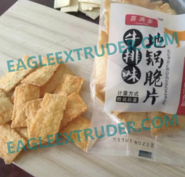 地鍋脆片膨化機主要以玉米粉,面粉為原料利用的擠壓成型工藝,生產市場行的鍋巴膨化食品。該機械生產線設計合理,自動化程度高,擠壓參數控制,主機配有高低壓螺桿,增加了原材料的使用范圍,降低了成本,改善了產品 的品質。該生產線可以通過更換成型機能夠生產不同類型的鍋巴,如平口鍋巴、鋸齒鍋巴,還有單層鍋巴、復合鍋巴,尺寸大小也可以通過更換模具實現產品。該產品具有形狀新穎、口感、營養豐富、組織細膩之特點,適合的市場需求,滿足人們日新月異的舌尖需求。