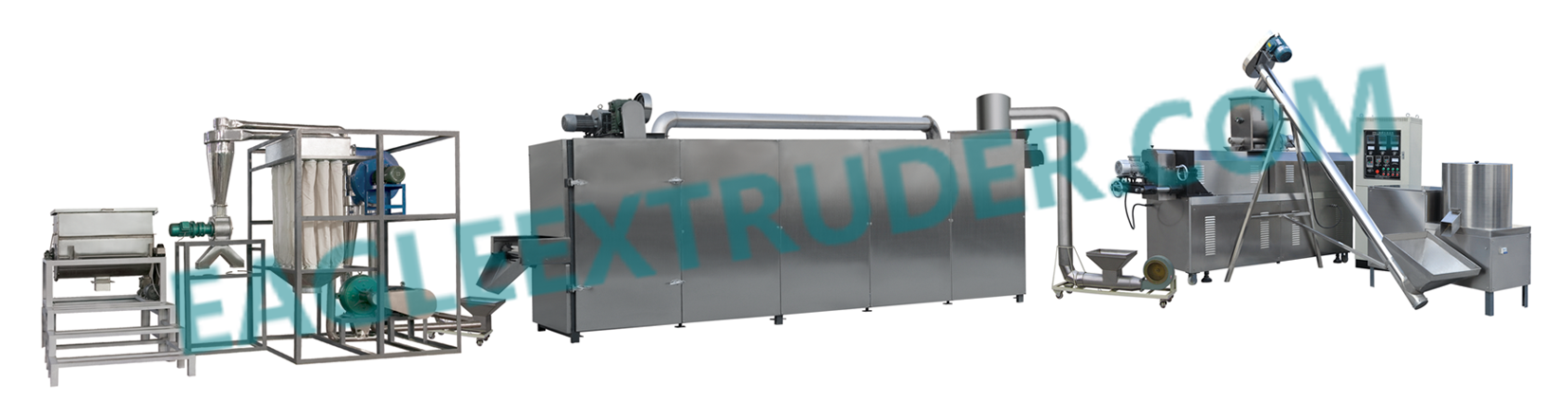 一、工藝流程:原料配制→拌料→輸送→擠壓膨化→輸送→干燥→粉碎→(包裝)